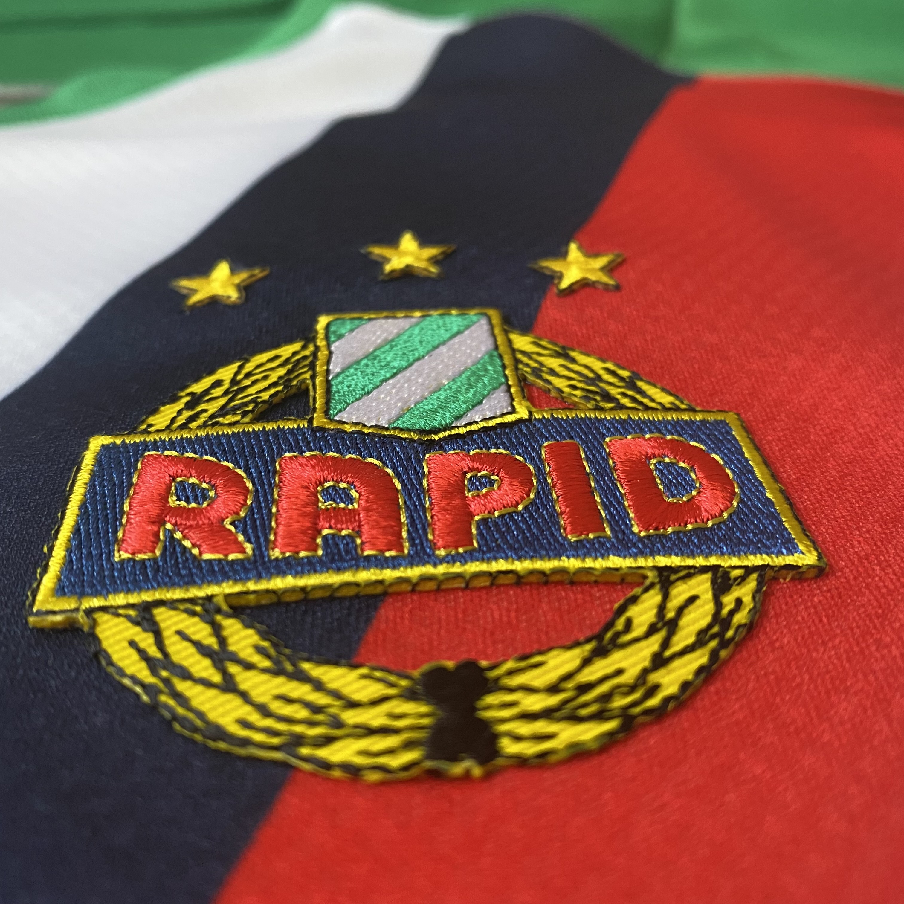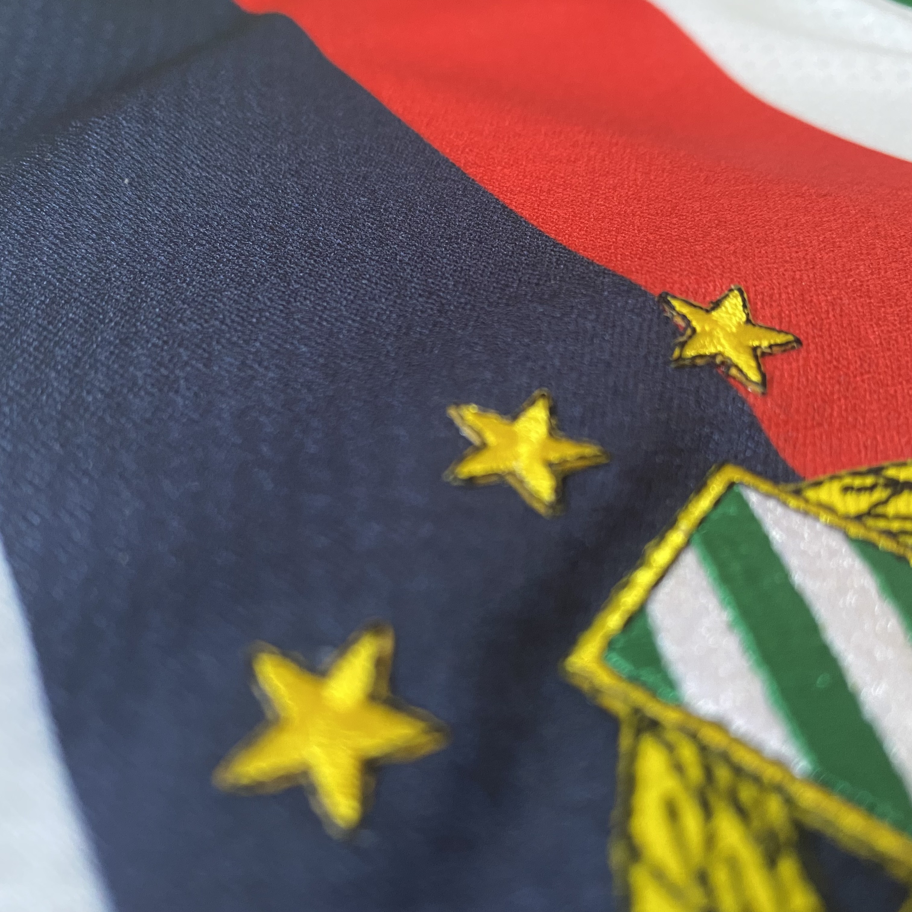 - Das Wappen steht weiter heraus als bei den Adidas-Trikots. Es dürfte aufgebügelt oder aufgeklebt sein, Nähte sind nicht zu sehen. Die Umrandungen sind weiters nicht so stark wie auf den Adidas-Trikots.